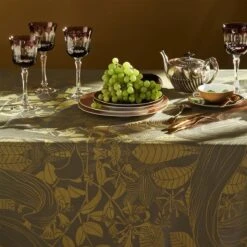 Chemin de table 100% coton damassé (jacquard) fabriqué en France à Gérardmer. Linge des Vosges. Tissé en compte serré fin, au toucher incomparable, comme la légèreté d’un foulard, ce chemin de table bénéficie du traitement anti-tache Green Sweet : votre linge de table reste propre et net.. Caractéristiques de Chemin de table Super nature or pale antitache déperlant :