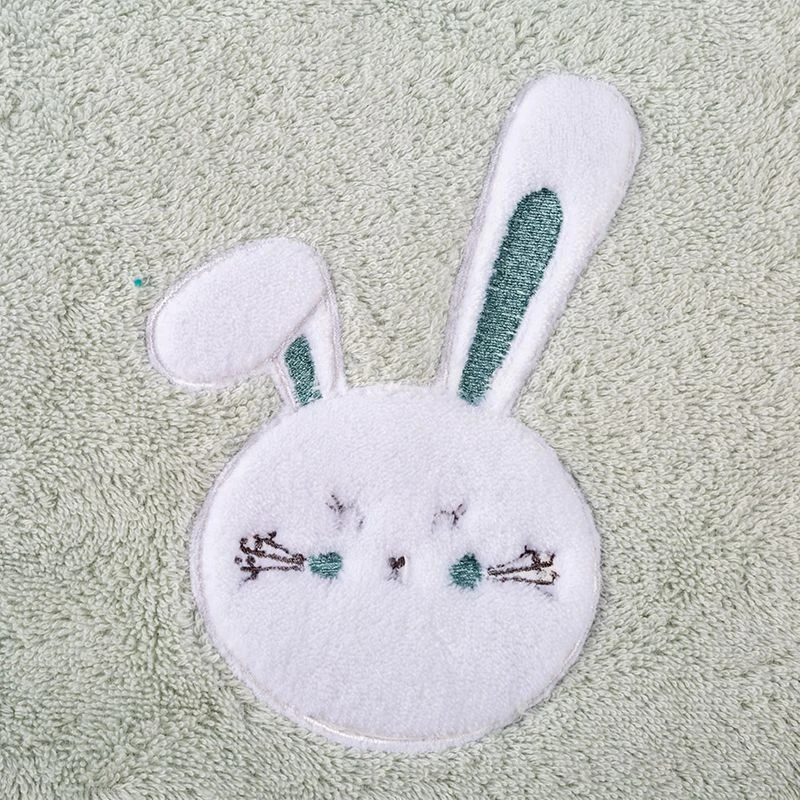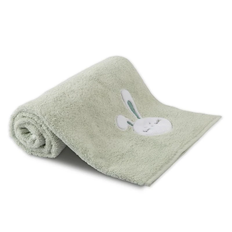 Drap de bain enfant avec motif brodé. Eponge bouclettes toute douce 100% coton.. Caractéristiques de Drap de douche Petit lapin vert d’eau :