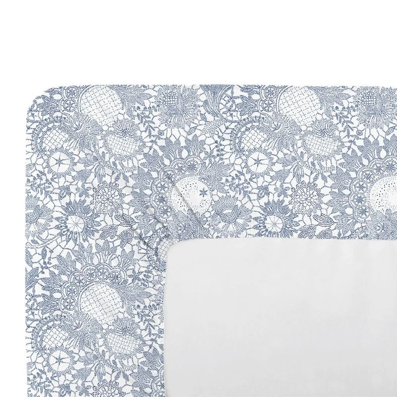 Drap housse imprimé sur percale de coton 80 fils/cm², 100% coton.. Caractéristiques de Drap housse b35 Guipures marine :
