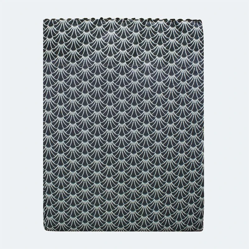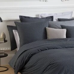 Drap plat imprimé en percale de coton 80 fils/cm², 100% coton. Drap housse et taie uni assortie : Ava bleu nuit et souris ou Olana bleu. Caractéristiques de Drap plat Osaka graphite :