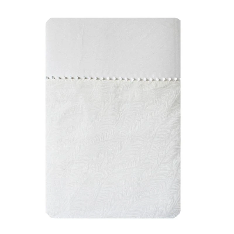 Drap plat blanc en satin de coton 120 fils/cm², 100% coton Ava uni Blanc avec parement jacquard et galon à pompons blancs en haut du drap. Qualité made in France. Linge des Vosges.Drap housse et taie unis assortis : Ava Blanc.. Caractéristiques de Drap plat Alula blanc :