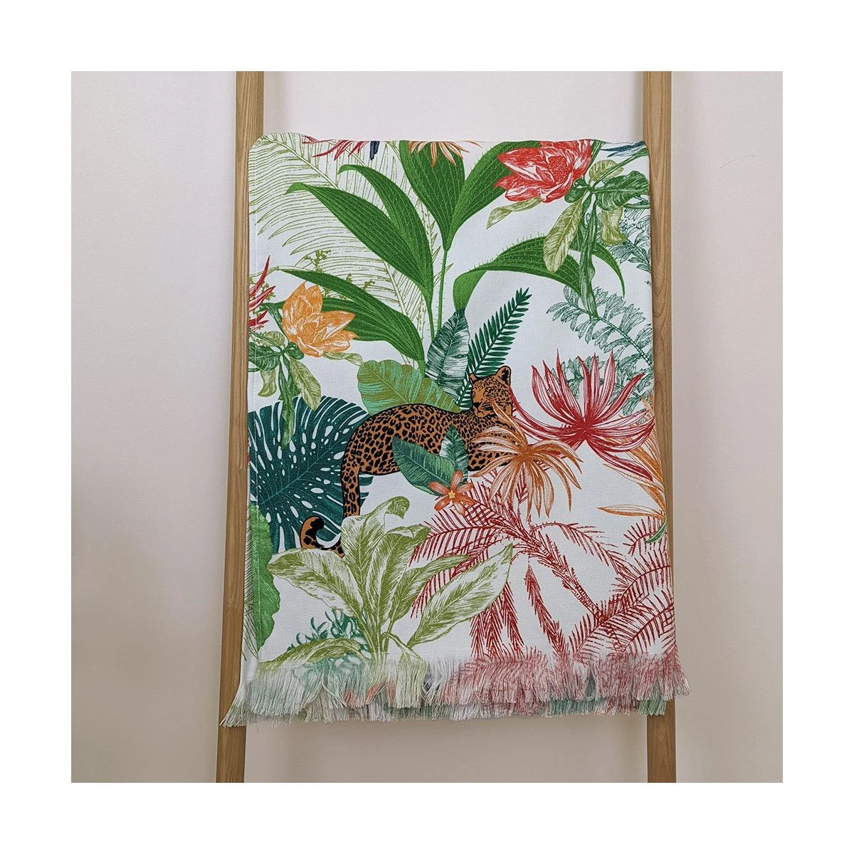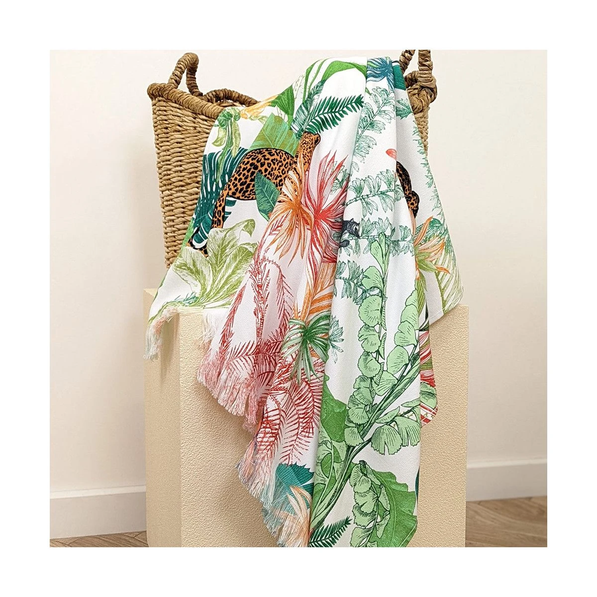 Fouta imprimée 100% coton. Une face rase côté imprimé, une face bouclettes coté blanc. Caractéristiques de Fouta Rainforest blanc :