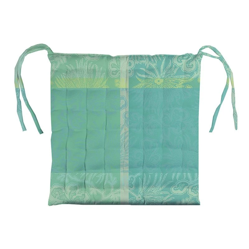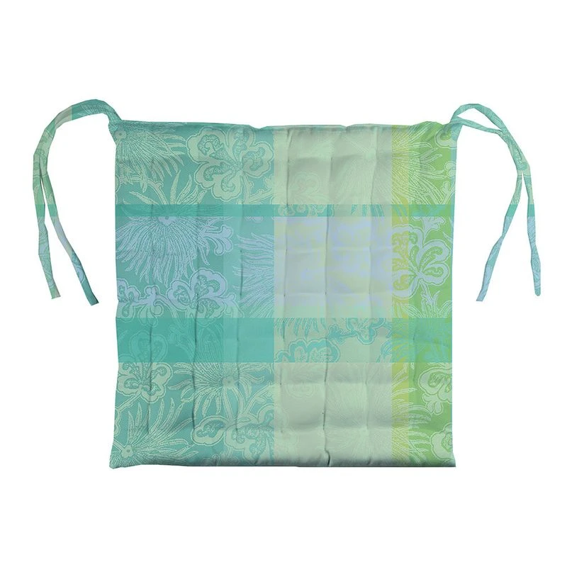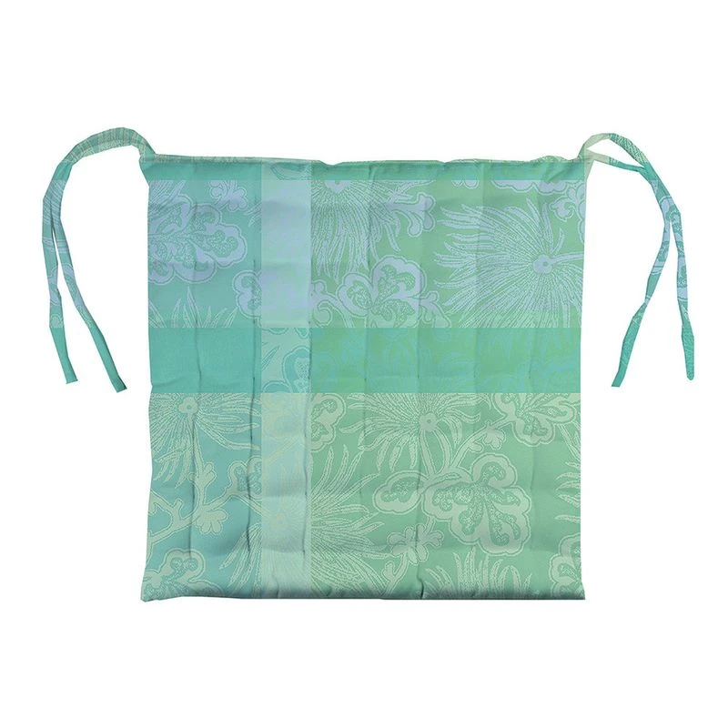 Qualité made in France. Linge des Vosges. Galette de chaise damassée (jacquard). Enveloppe 100% coton dont une face en coton enduit pour un entretien facile ; Garniture 100% polyester. Ces produits sont découpés de façon aléatoire dans le tissu all over, aussi les motifs, comme les couleurs peuvent varier d’un produit à l’autre et par rapport au visuel.. Caractéristiques de Galette de chaise Mille venusta aqua enduit imperméable :