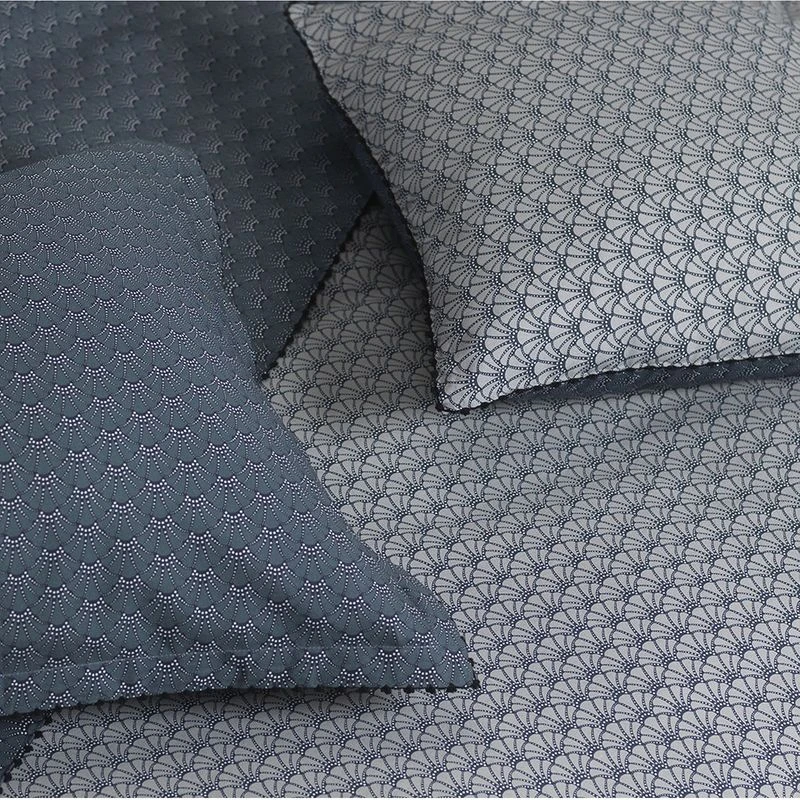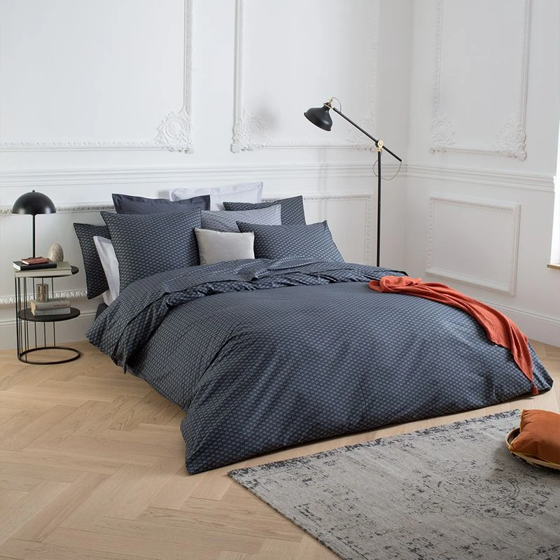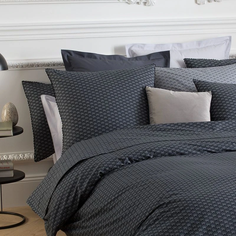 Ecailles japonisantes en tons givrés. Micro-motif indémodable, chic et facile à marier avec une décoration d’intérieur contemporaine. Housse de couette imprimée sur percale de coton 80 fils/cm², 100% coton, recto fond gris motifs bleus, verso fond bleu motifs gris. Draps housses assortis : percale Olana Platine, Olana Acier. Caractéristiques de Housse de couette Osaka givre :