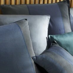 Housse de couette imprimée sur satin de coton 120 fils/cm², 100% coton, doux et soyeux. Draps housses et taies unis assortis : Ava Bleu nuit et Titane ou Olana Bleu et Acier. Caractéristiques de Housse de couette Dandy blue :