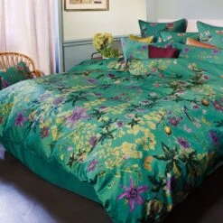 Housse de couette imprimée sur satin de coton 120 fils/cm², 100% coton, doux et soyeux. Motif linéaire, verso en satin uni émeraude. Draps housses et taies unis assortis : Ava Canard, Ava Gold. Caractéristiques de Housse de couette Passiflore emeraude :