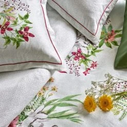 Housse de couette imprimée sur satin de coton 120 fils/cm², 100% coton, doux et soyeux. All over floral au recto, micro-motif végétal au verso. Drap housse et taie unis assortis : Ava Sauge, Ava Dahlia. Caractéristiques de Housse de couette Clematites printemps :