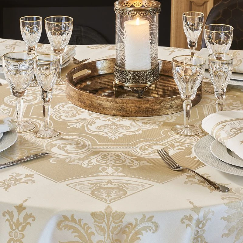 Précieux, fastueux, généreux,… Les plus beaux ornements style Renaissance, sublimés par des reflets mordorés pour une nappe aux mille éclats.. Caractéristiques de Nappe Eleonore dore antitache déperlant :