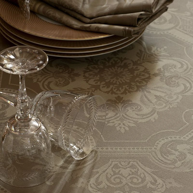 Nappe 100% coton damassé (jacquard) fabriquée en France à Gérardmer. Linge des Vosges. Cette nappe bénéficie du traitement anti-tache Green Sweet : votre linge de table reste propre et net.. Caractéristiques de Nappe Fontainebleau gris antitache déperlant :