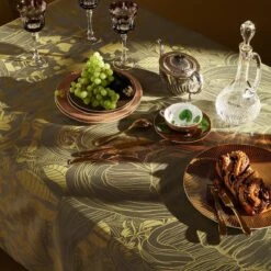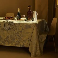 Nappe 100% coton damassé (jacquard) fabriquee en France à Gérardmer. Tissé en compte serré fin, au toucher incomparable, comme la légèreté d’un foulard. Cette nappe bénéficie du traitement anti-tache Green Sweet : votre linge de table reste propre et net. Avec cette nappe réversible, vous pouvez mettre en valeur son motif floral gris sur fond kaki doré ou à l’inverse son motif floral kaki doré sur fond gris !. Caractéristiques de Nappe Super nature or pale antitache déperlant :