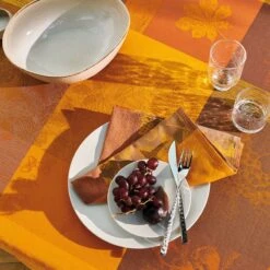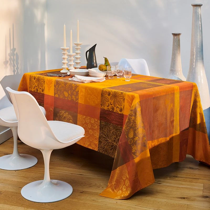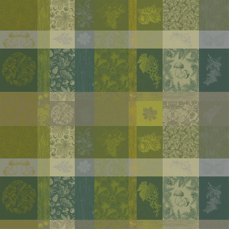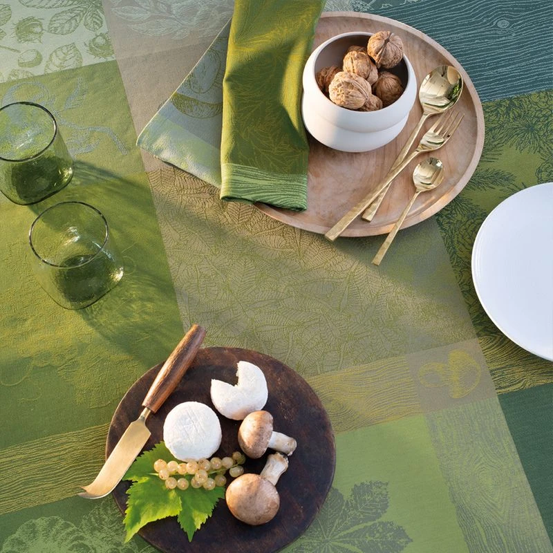 Qualité made in France. Linge des Vosges. Nappe 100% coton damassée (jacquard). Recouverte de 2 fines couches d’enduction acrylique, elle se nettoie facilement d’un simple coup d’éponge ! Egalement disponible en coton sans enduction.. Caractéristiques de Nappe Mille bois d’automne mousse enduit imperméable :