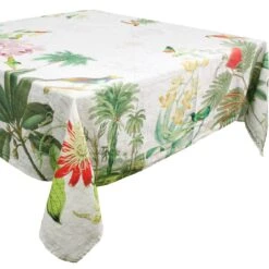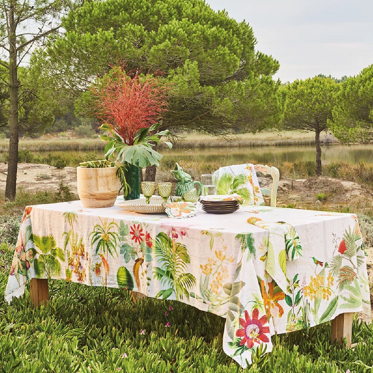 Ensemble de table imprimé sur métis lavé (50% coton, 50% lin), très facile d’entretien. Tissu prélavé pour plus de souplesse et un effet légèrement froissé permanent (repassage inutile). Du fait du lavage, les dimensions peuvent varier d’un produit à l’autre, les dimensions indiquées sont basées sur une moyenne des résultats observés.. Caractéristiques de Nappe Escales paradis lavé :