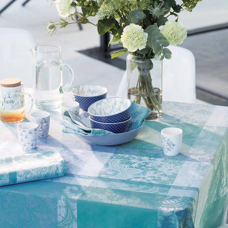 Nappe 100% coton damassé (jacquard) fabriquée en France à Gérardmer. Linge des Vosges.. Caractéristiques de Nappe Mille dentelles turquoise :
