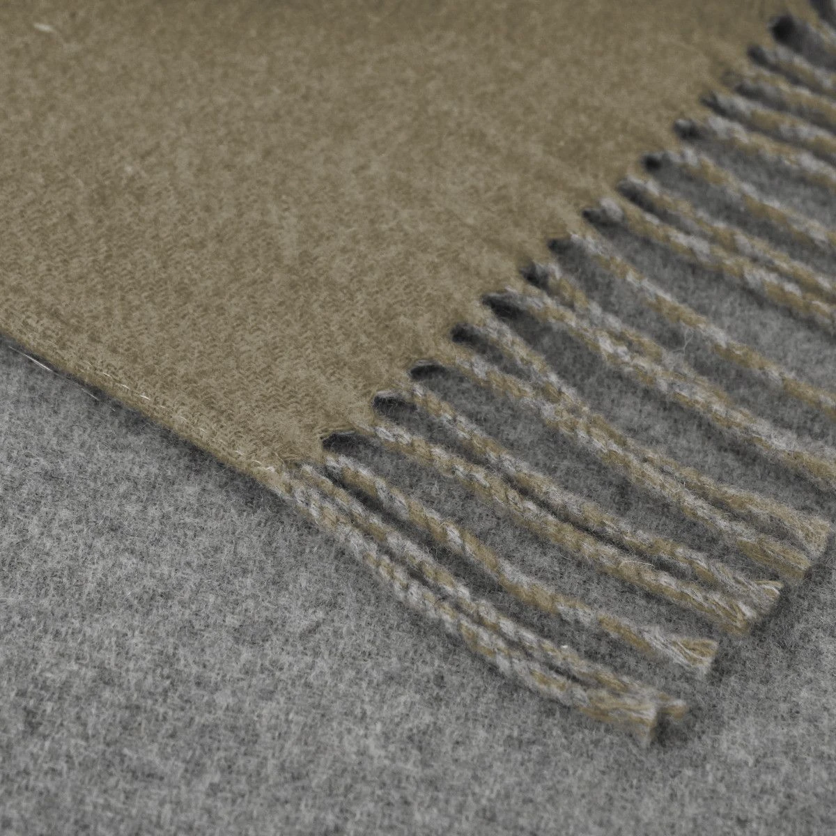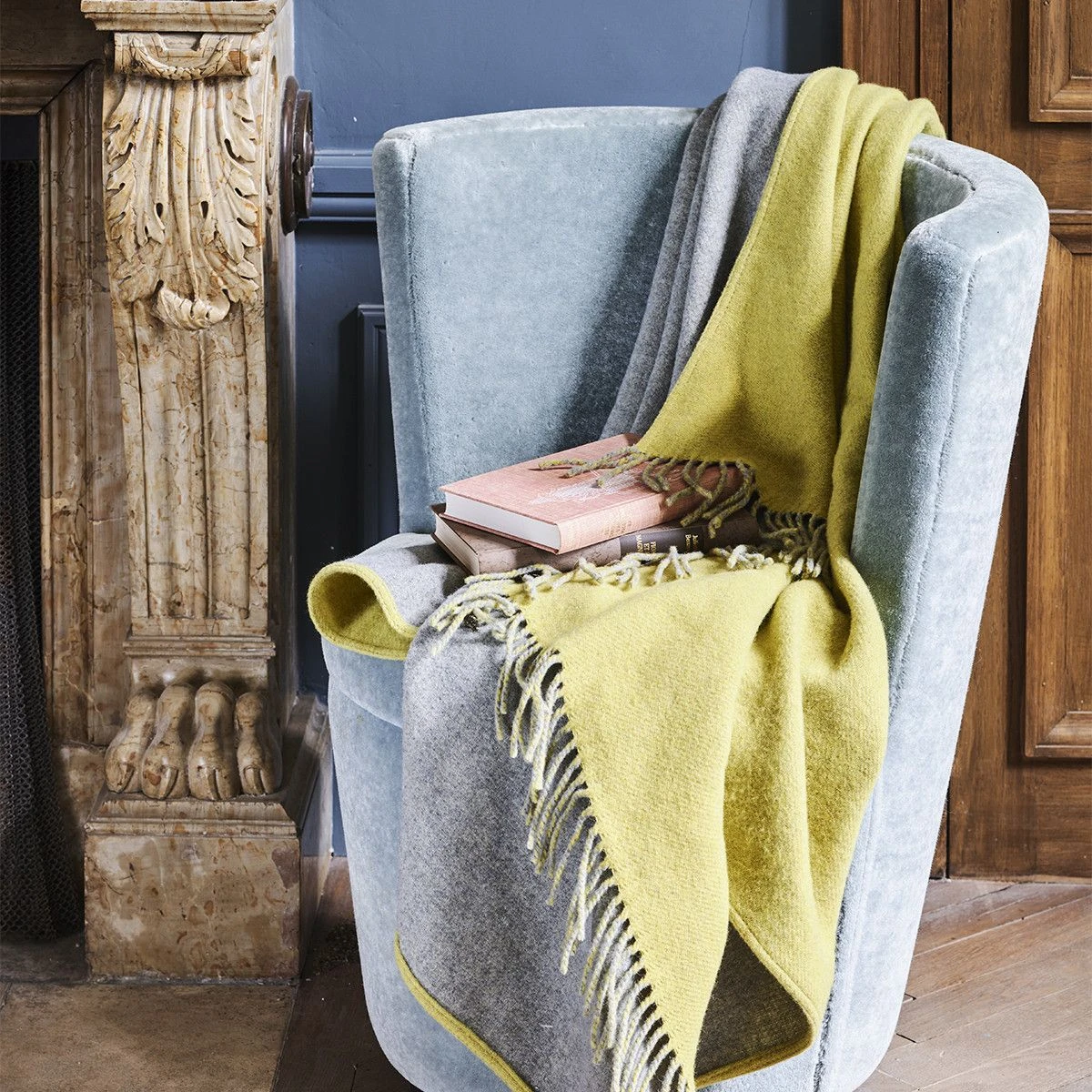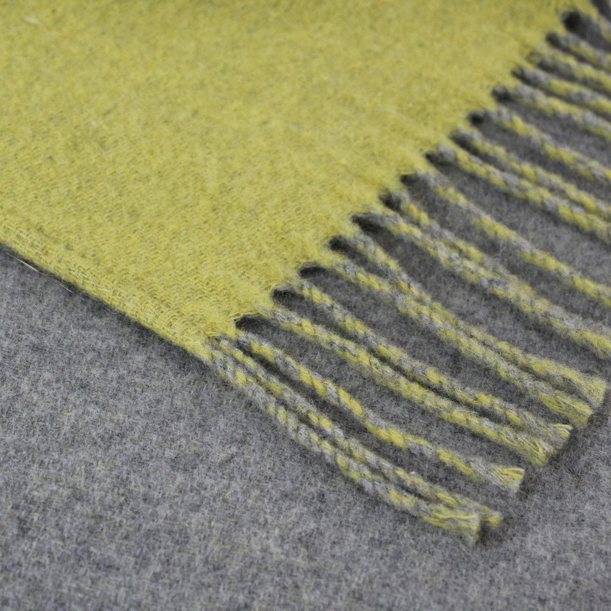 Mélange de laine d’agneau et de polyamide (70% laine d’agneau / 30% polyamide) qui confère chaleur et douceur à ce plaid. Un côté uni jaune-vert acide, un côté uni gris. Caractéristiques de Plaid Duetto limoni :