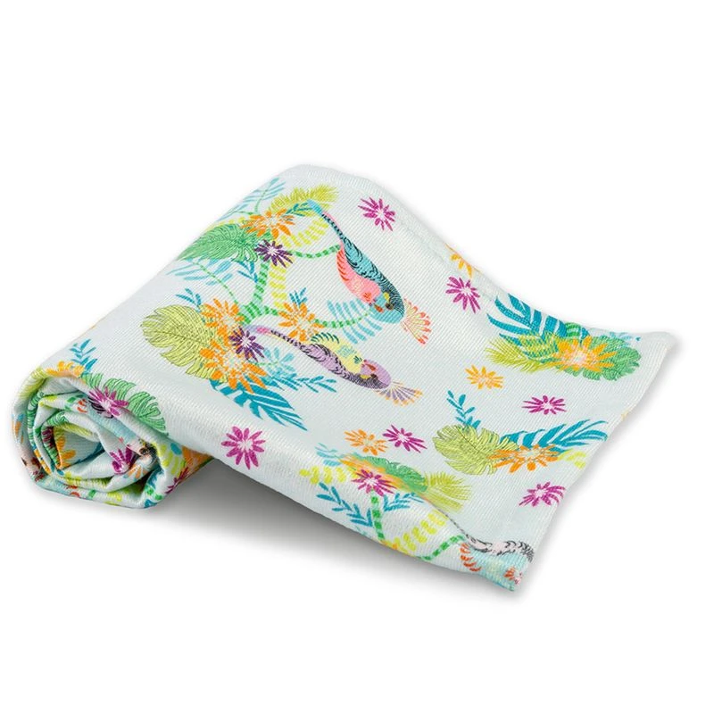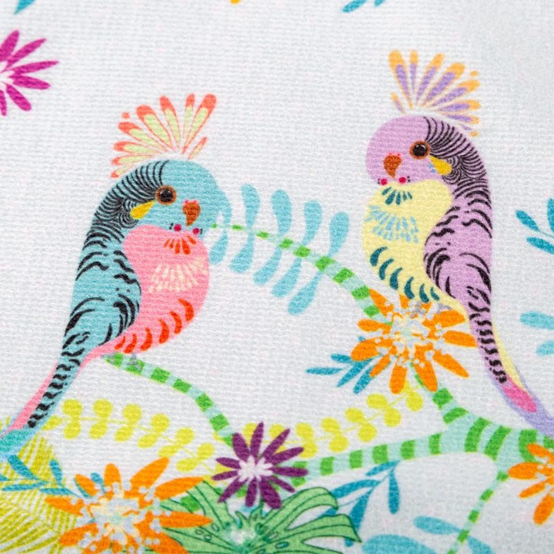 Serviette de bain enfant 60% coton/40% polyester, toute douce. Recto face imprimée, verso face bouclette. Caractéristiques de Serviette eponge Perruches print aqua :