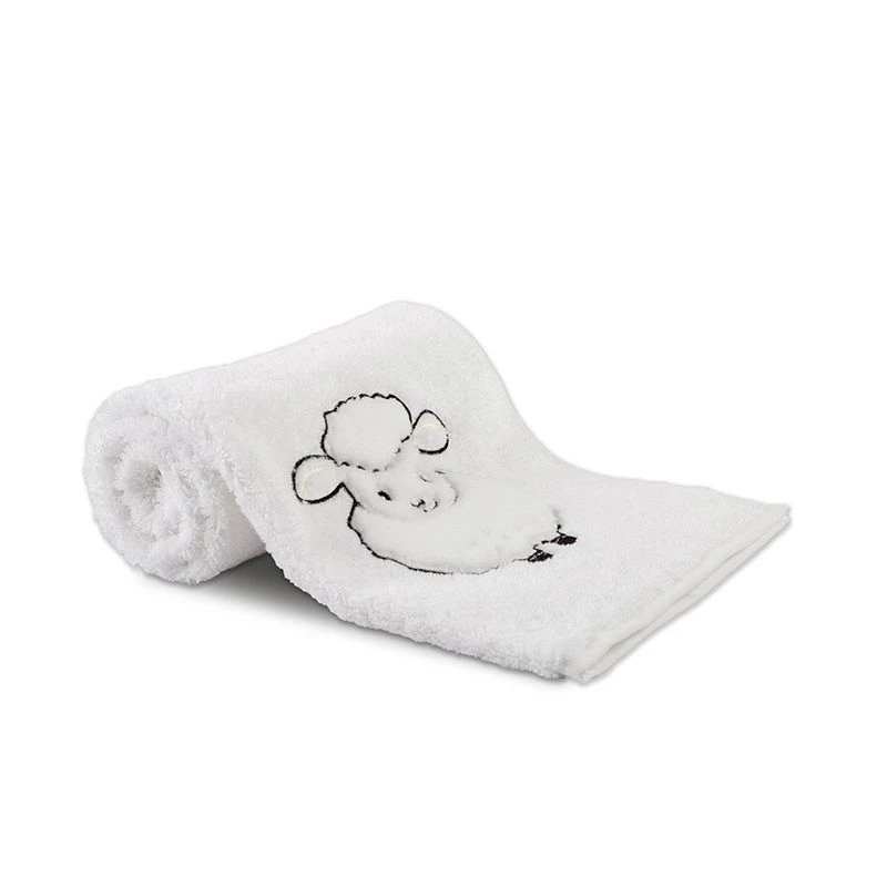 Serviette de bain enfant avec motif brodé. Eponge bouclettes toute douce 100% coton. Caractéristiques de Serviette eponge Petit mouton blanc :
