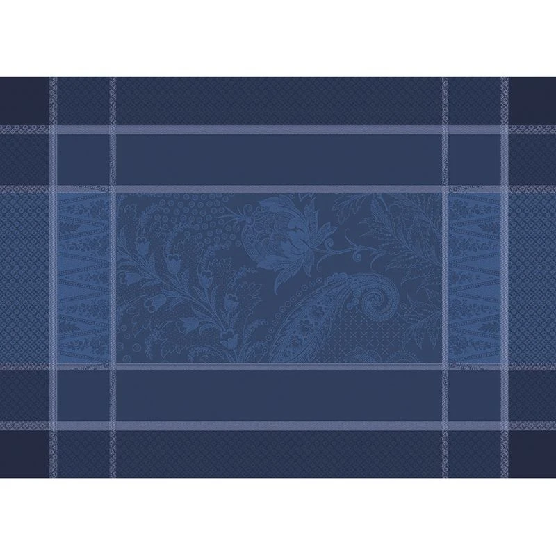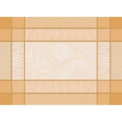 Set de table en coton damassé (jacquard) avec fils métalliques or. Qualité made in France. Linge des Vosges. Motifs dont la finesse est particulièrement mise en valeur par le tissage en compte serré. Finitions raffinées avec des coins capuchons. Ce set de table bénéficie du traitement anti-tache Green Sweet : votre linge de table reste propre. Caractéristiques de Set Persina or antitache déperlant :