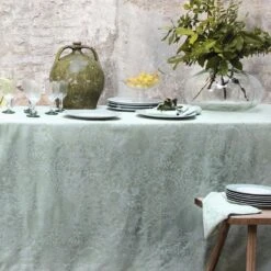 Set de table enduit 100% coton damassé (jacquard) fabriqué en France à Gérardmer. Linge des Vosges. Recouvert de 2 fines couches d’enduction acrylique, il se nettoie facilement d’un simple coup d’éponge ! Les sets sont découpés de façon aléatoire dans le tissu de la nappe, aussi les motifs, comme les couleurs peuvent varier d’un set à l’autre ainsi que par rapport à la photo.. Caractéristiques de Set Mille guipures jade enduit imperméable :