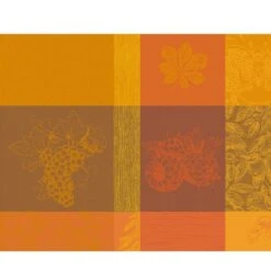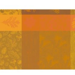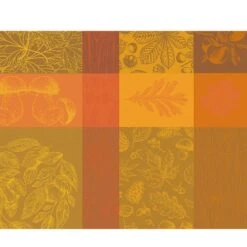 Set de table 100% coton damassé (jacquard) fabriqué à Gérardmer, dans les Vosges. Les sets sont découpés de façon aléatoire dans le tissu de la nappe, aussi les motifs, comme les couleurs peuvent varier d’un set à l’autre ainsi que par rapport à la photo.. Caractéristiques de Set Mille bois d’automne potiron :