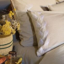 Taie d’oreiller en percale de coton 80 fils/cm², 100% coton effet chambray. Broderie sur un angle de la taie carrée et de chaque côté de la taie rectangulaire. Drap housse et taie unis assortis : Olana Ecru. Caractéristiques de Taie d’oreiller Brise d’ete naturel :