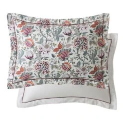 Taie d’oreiller imprimée sur satin de coton 120 fils/cm², 100% coton, doux et soyeux. Verso uni angora. Draps housses et taies unis assortis : Ava Angora et Dahlia ou Olana Kaki, rouille et Raisin. Caractéristiques de Taie d’oreiller Camille angora :