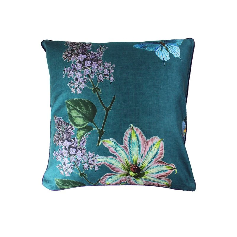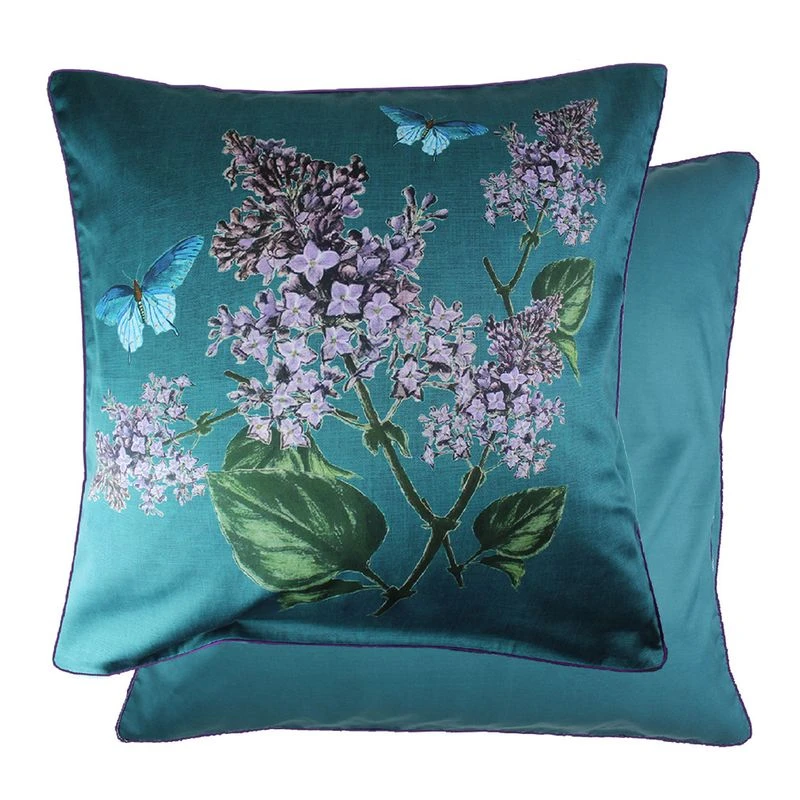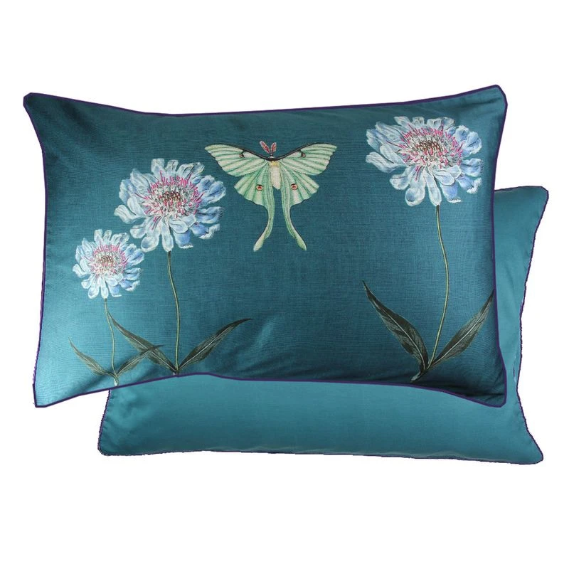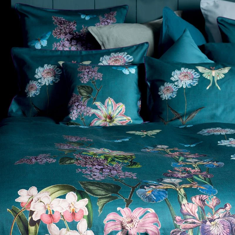 Taie d’oreiller imprimée en satin de coton 120 fils/cm², 100% coton. Verso en satin de coton 120 fils/cm² uni Ava Canard.. Caractéristiques de Taie d’oreiller Iris canard :