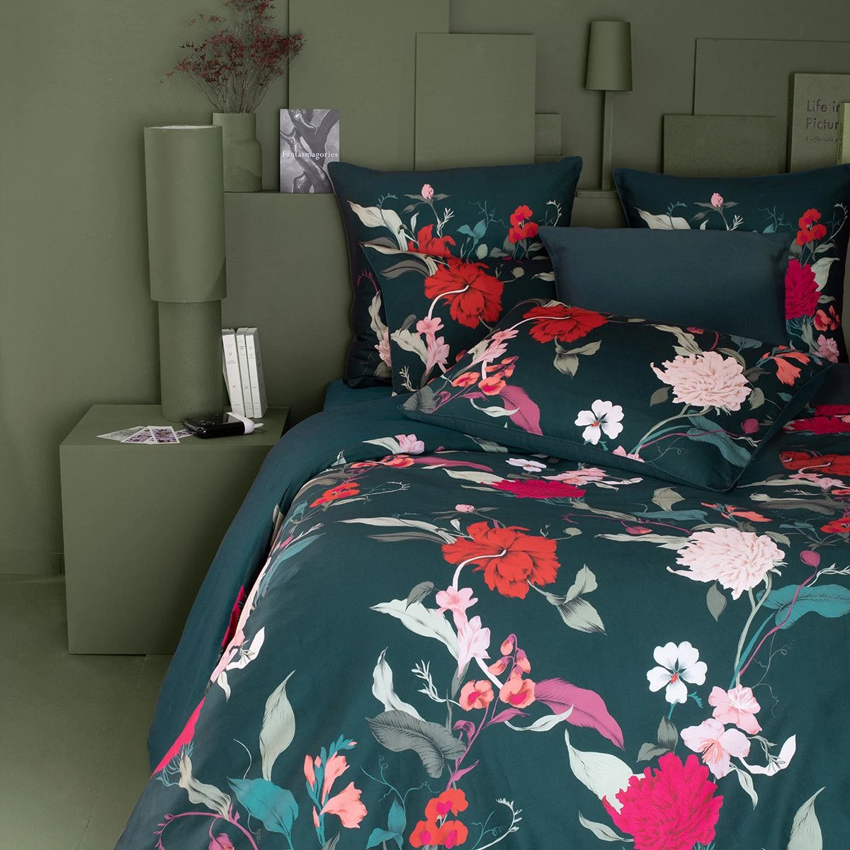 Taie d’oreiller imprimée sur satin de coton 120 fils/cm², 100% coton. Doux et soyeux, le satin donne à ce linge un aspect brillant et lisse. Motif floral placé ; verso en satin uni vert crépuscule. Draps housses et taies unis assortis : Ava Crépuscule.. Caractéristiques de Taie d’oreiller Parfums crepuscule :